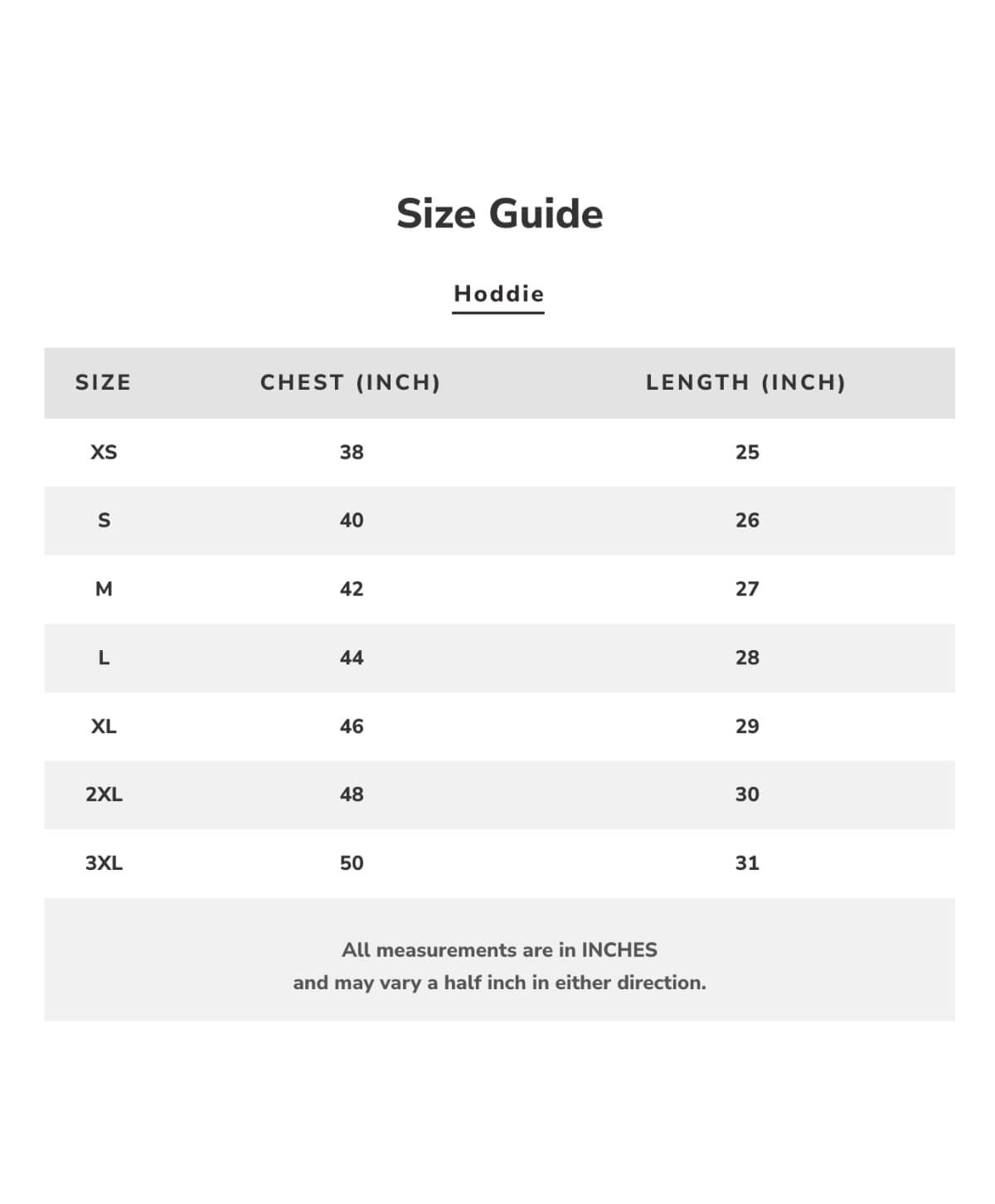 | Hoodie Guide | XS, S, M, L, XL, 2XL, 3XL |